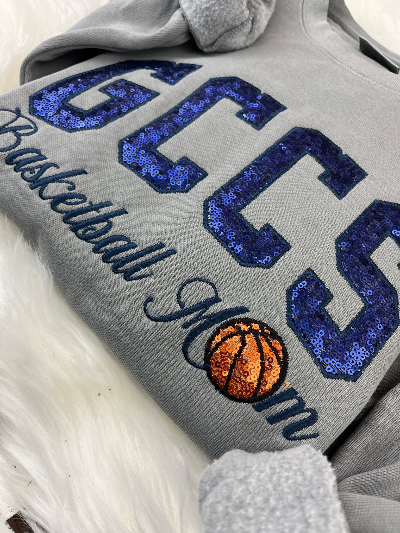 Show your school spirit in style with our GCCS – Basketball Mom design! This eye-catching piece features GCCS done in navy sequin fabric, paired with Basketball Mom in an elegant cursive script. For an extra fun touch, the “O” in Mom is an orange sequin basketball 🏀—perfect for proud Gloucester County Christian School basketball moms.