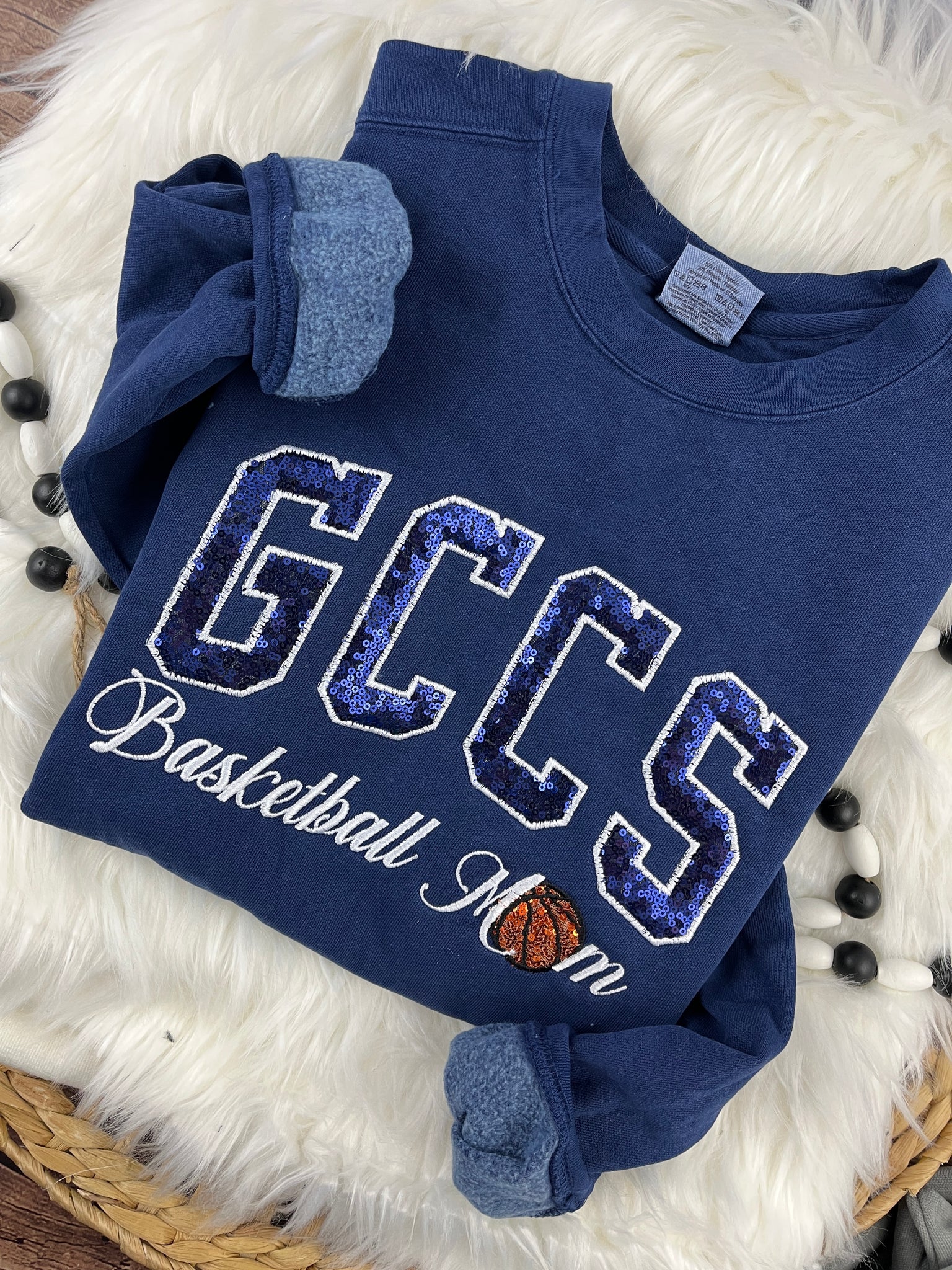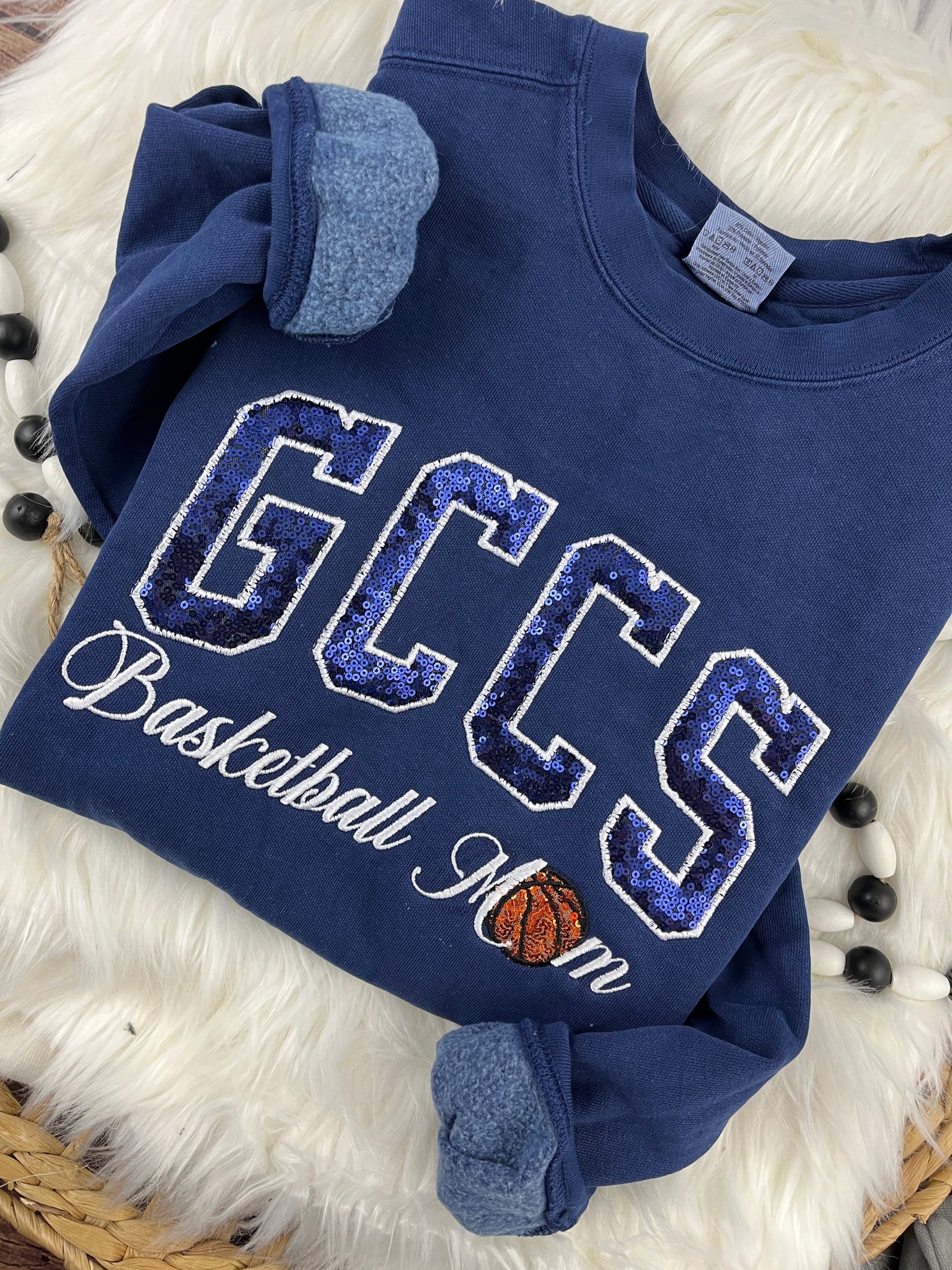 Show your school spirit in style with our GCCS – Basketball Mom design! This eye-catching piece features GCCS done in navy sequin fabric, paired with Basketball Mom in an elegant cursive script. For an extra fun touch, the “O” in Mom is an orange sequin basketball 🏀—perfect for proud Gloucester County Christian School basketball moms.