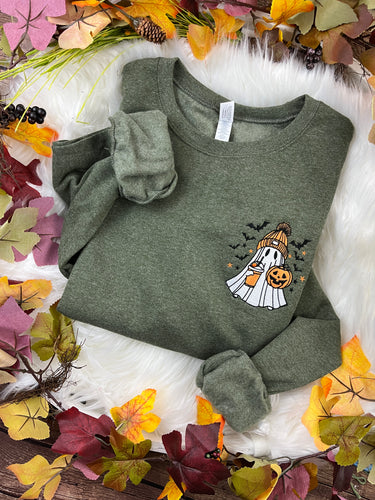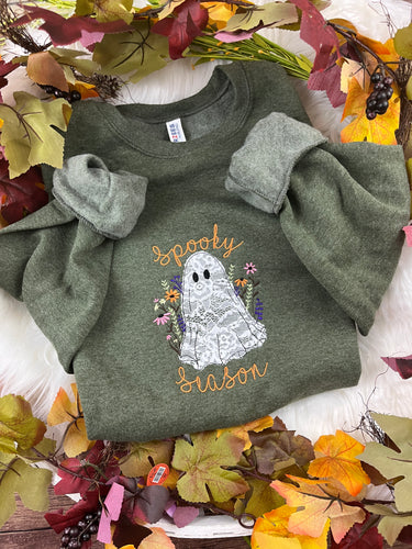 Floral Ghost “Spooky Season” Embroidered Sweatshirt or Tee – White Lace Boho Ghost | Halloween Fall Aesthetic | Comfort Colors or Jerzees