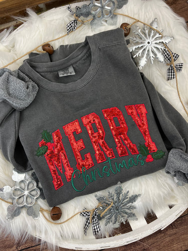 MERRY Sequin Christmas Sweatshirt Curved Script Holiday Pullover with Holly Berries | Comfort Colors or Jerzees Crewneck. Gift Ideas.